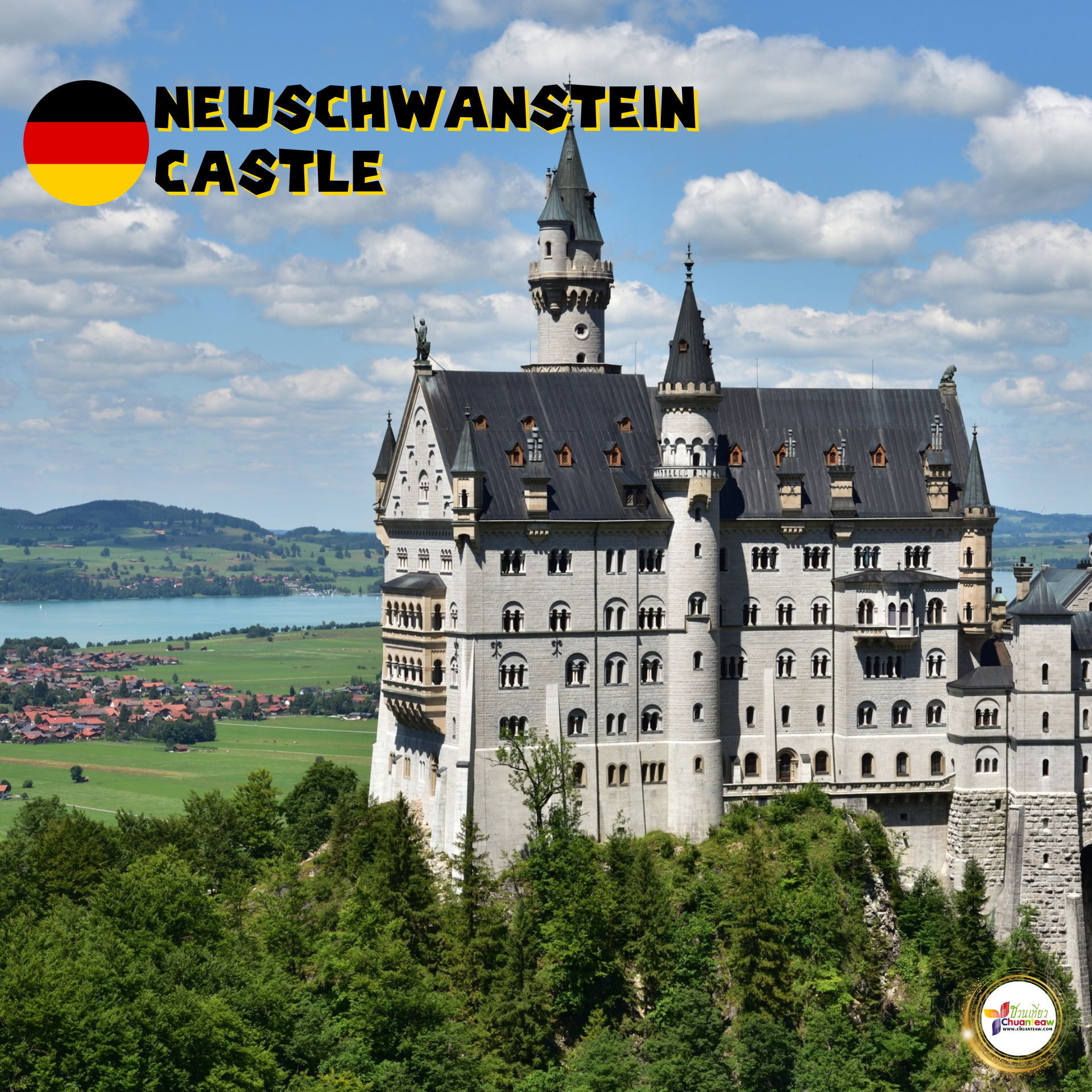 ปราสาทสีขาวตั้งเด่นอยู่บนยอดเขา ท่ามกลางป่าสีเขียวและภูเขาแอลป์ เป็นแรงบันดาลใจให้กับปราสาทเจ้าหญิงดิสนีย์